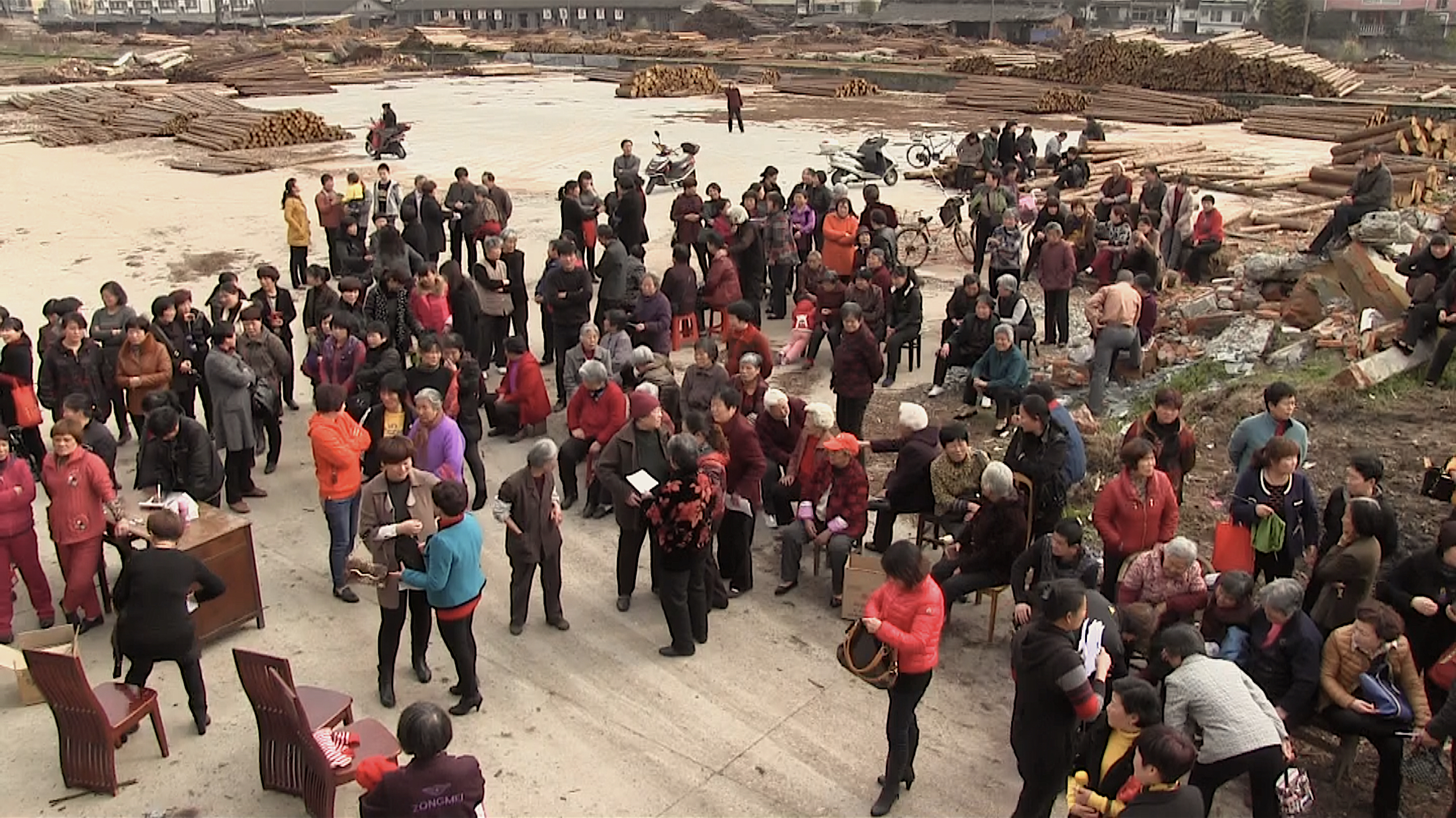 Header: Former workers gather at a partially demolished sawmill in Fujian to draft a petition arguing for fair pensions, 2014. (Shuxuan Zhou)