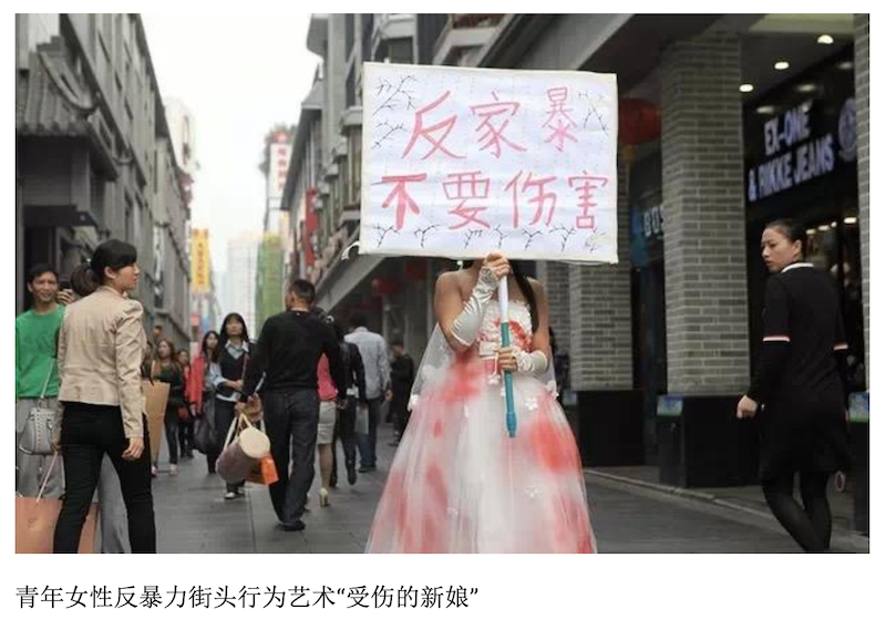 Countless Yingzhis live among us, while the Zitaos of China are fading away with time. The tears of Chinese women, if unleashed, could drown a nation. Yet many women refuse to accept tragedy as their fate, wielding their voices and their bodies against the patriarchal order. They fight for their rights in court, and push back against discriminatory policies. On Valentine’s Day in 2012, three young female Chinese activists marched in the streets of Beijing, wearing wedding gowns stained by artificial blood. One of their placards read: “Beating is not intimacy. Verbal abuse is not love.” The following year, the same feminist outfit helped a group of village wives stage a demonstration against unequal land access. In a scene reminiscent of the “speaking bitterness” sessions from the 1960s, using elements of the same revolutionary theatrics, the women prostrated in front of a government building and covered their bodies in protest banners.